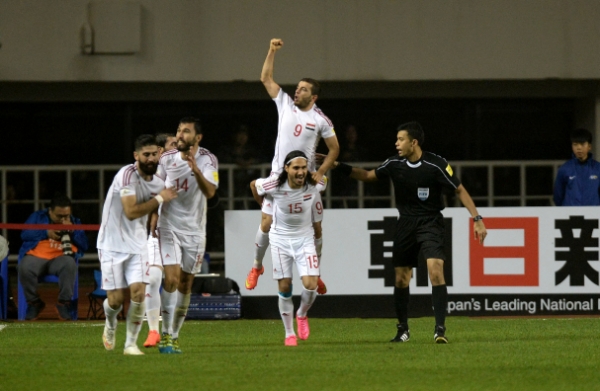 10月6日,叙利亚队球员马瓦斯(上)进球后与队友庆祝。