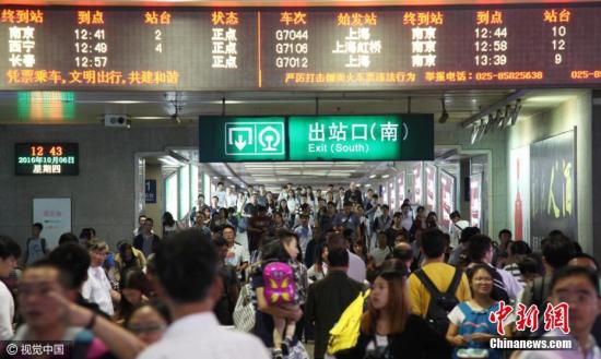 2016年10月6日,江苏省南京市,抵达南京火车站的旅客在出站。随着国庆长假接近尾声,外出游玩和探亲的旅客开始陆续返程,南京火车站迎来国庆长假返程高峰。 建华 摄 图片来源:视觉中国