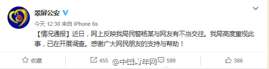 此前一天,宜宾市公安局翠屏分局通报称,关于网传的民警杨某与网友的不当交往,已在开展调查。