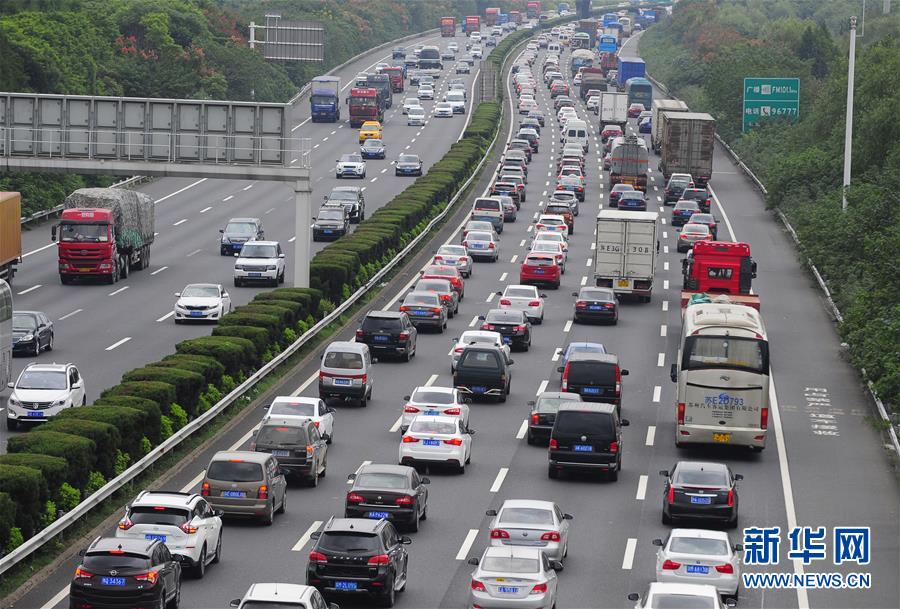 10月6日,在沪宁高速公路无锡段,往上海方向的车辆行驶缓慢。国庆假期进入第六天,随着长假进入尾声,长线游客陆续返程,民航、铁路、公路相继进入返程高峰。 新华社发(还月亮 摄)