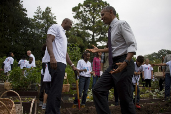 奥巴马脱去西装外套,出现在白宫菜园,和小朋友握手打招呼,更和他熟识的退役NBA热火队球员莫宁(Alonzo Mourning)聊得起劲。