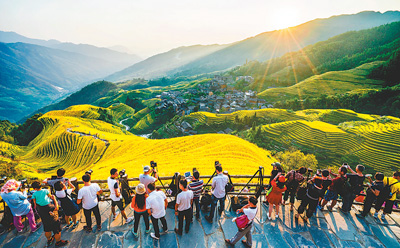 游客在广西龙胜各族自治县龙脊梯田景区游览拍照。 庞革平 黄勇丹摄影报道 |