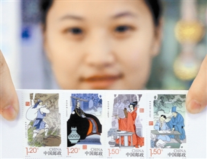 10月7日,山东省邹城市邮政局工作人员展示《中华孝道(二)》特种邮票。当日,中国邮政发行《中华孝道(二)》特种邮票1套4枚,图案内容分别为“百里负米”“亲尝汤药”“文姬续书”和“恺之画母”,全套邮票面值5.40元。