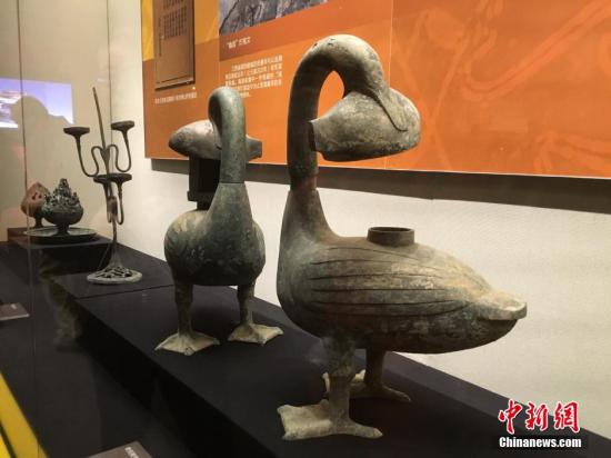 图为海昏侯墓出土青铜雁鱼灯。 中新网记者 翟璐 摄