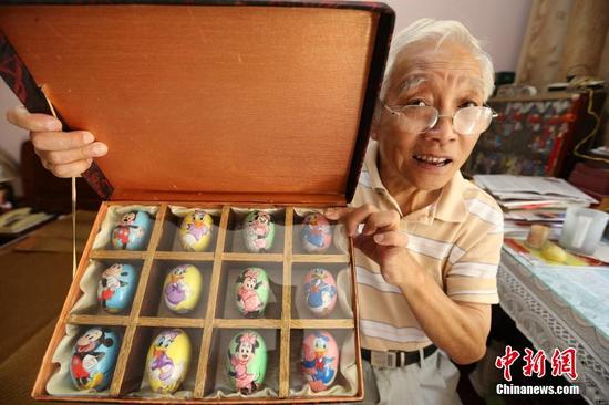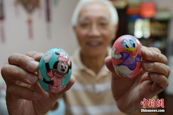 老人展示迪士尼系列蛋壳画。 中新社记者 王亚东 摄