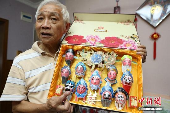 这位今年78岁的老人名叫费永泉,已经在蛋壳上作画十余年。这些年来,费永泉创作的蛋壳画超过2500幅。作为京剧迷,费永泉的作品囊括了《西游记》、《三国演义》、《水浒传》、《封神演义》等古典名著中的人物形象。最近,他又创作完成了年画、生肖以及迪士尼系类蛋壳画作品。图为8月底,老人展示他的蛋壳画作品。
