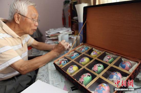 图为8月底,老人在制作迪士尼系列蛋壳画。 中新社记者 王亚东 摄