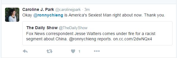 据《华尔街邮报》报道 在著名脱口秀节目“每日秀”的节目片段里,罗尼用犀利又不失幽默的语言大批沃特斯和福克斯新闻。“这种东西怎么会出现在新闻里,甚至出现在电视里?”“如果辩论里提到了中国,你就去纽约的华埠,那提到了墨西哥你是不是要去Taco Bell(墨西哥快餐连锁店)?华埠和中国根本不一样!这就像如果提到了女性权利,我就去??怂剐挛挪煞萌嗣窍敕ㄒ谎?”罗尼·成说。