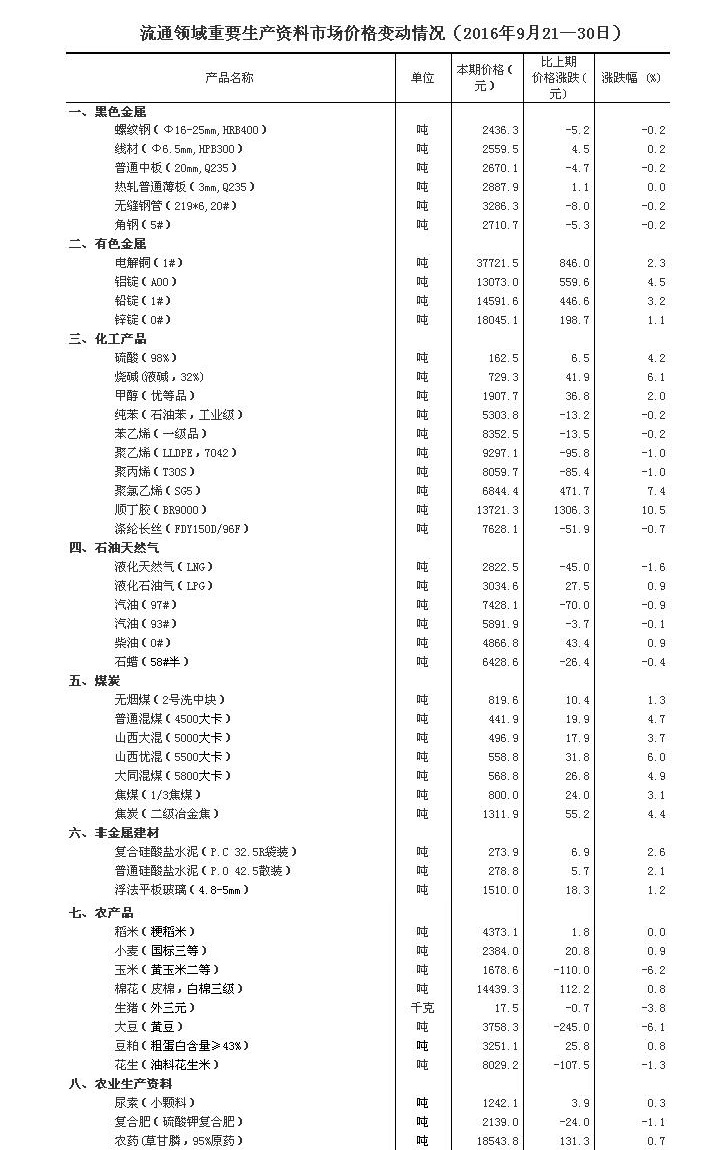 国家统计局9日发布流通领域重要生产资料市场价格变动情况。2016年9月下旬,据对24个?。ㄇ⑹校┝魍煊?大类50种重要生产资料市场价格的监测显示,与9月中旬相比,28种产品价格上涨,19种下降,3种持平。