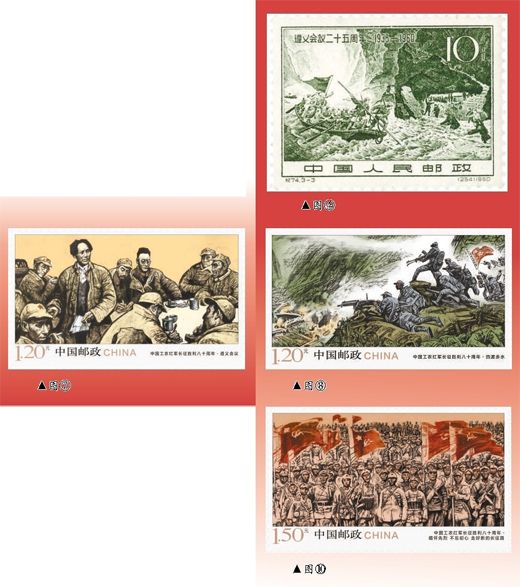 在纪念遵义会议30周年的邮票上,最醒目的是单独发行了毛泽东1949年以后的标准肖像,表明了遵义会议重要的历史性决定:确立毛泽东的领导地位。此外,这套邮票还将长征中的“娄山关大捷”场景纳入图案——采用彭彬的油画《雄关漫道真如铁,而今迈步从头越》,以表现从遵义开始的新的长征充满希望的前景。