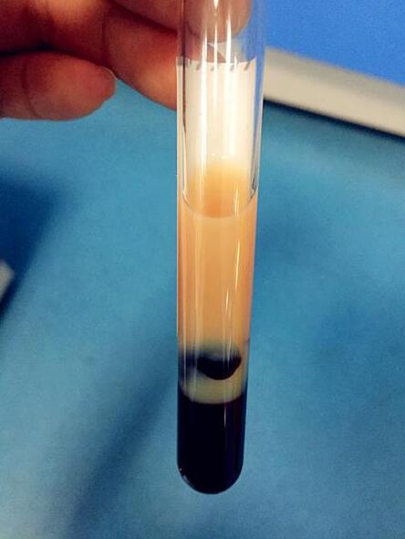 马大爷的血液标本经过沉淀后,血清看起来浑浊,如果完全离心后则看起来会像牛奶(由医院提供)