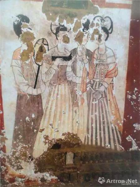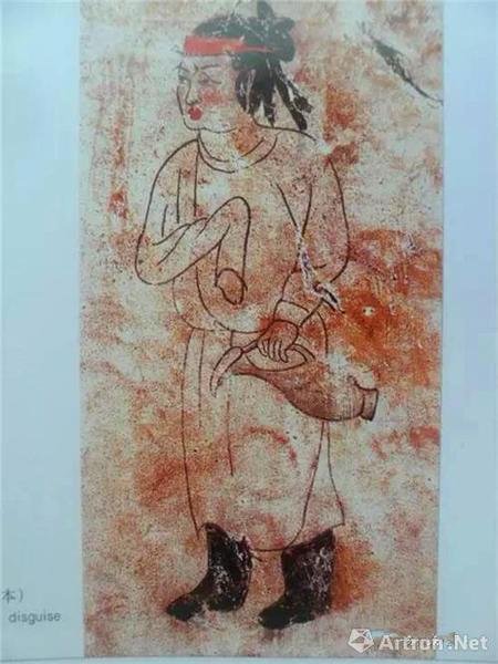 燕德妃墓(唐671年)《提壶男装女侍图》中绘一女侍,头戴黑色幞头帽,身着圆领窄袖白袍,黑白条纹波斯裤、尖口鞋,左手提一胡瓶,胡瓶形制、纹饰均与新城公主墓胡瓶基本一致。