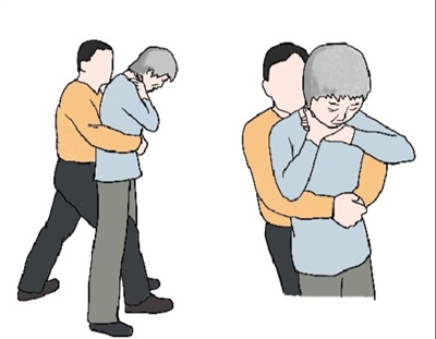 2. 双臂环抱患者腰腹部,一手握拳,拳眼置于脐上两横指的上腹部,另一手固定拳头,并突然、连续、快速、用力向患者上腹部的后上方冲击,直至气道阻塞异物排出。