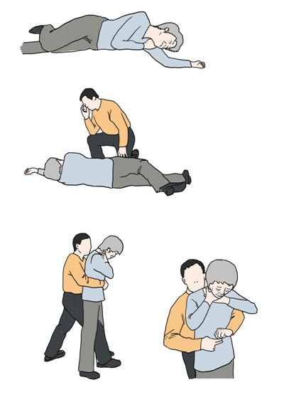 采取“稳定侧卧位”,保持气道通畅。注意清理口腔内的呕吐物、分泌物;不要喂水、喂药。如果老人有活动假牙,应立即取出,以防发生窒息。(制图 孙嘉潞)