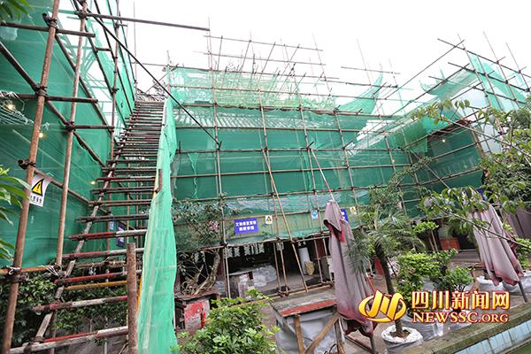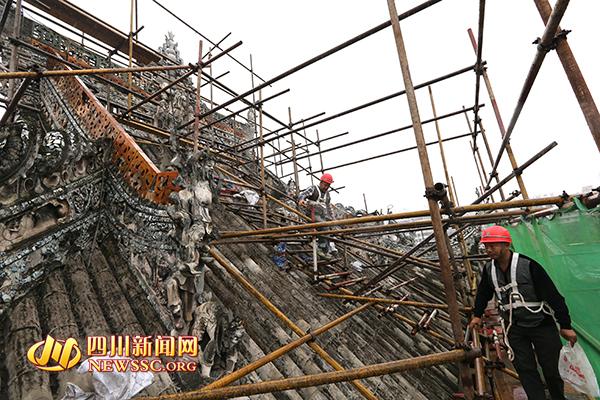今天上午,四川新闻网记者在王爷庙看到,王爷庙内部已经安装好了层层叠叠的脚手架,工人正在脚手架上紧张的施工。据现场施工负责人介绍,此次排危修缮范围包括戏楼、东西厢房、东廊亭和西回廊,主要对屋面漏水部分进行覆盖,对中垒、鳌鱼、盘龙、人物等缺失、风化、脱落等进行修补、恢复,遭朽膜结构进行修复、更换并进行“三防”处理,对围墙、山墙涂料进行修补、修复等,“以解决这座古建筑,屋面漏水,正脊风化破损等问题?!薄?/p>