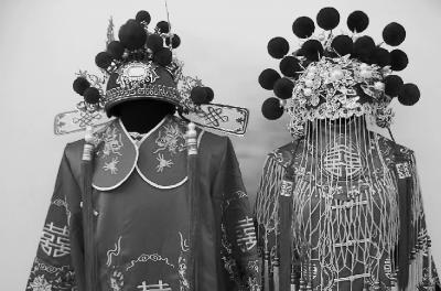 民间婚礼上新娘戴的凤冠(右),其样式简单而普通,不过它与古时真正的凤冠不是同一个概念,民间婚礼上的凤冠只是借用了凤冠的形和名。