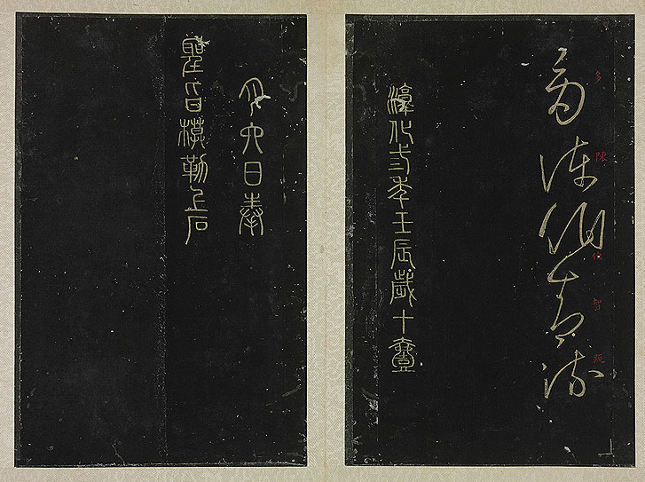 如石鼓文,拓本都是清后期所拓的两种,一种为阮元重刻本,其“黄帛”和“氐鲜”几字都是完整的;另一种是光绪十二年(1886年),由盛昱重新翻刻阮元的翻刻本的拓本。