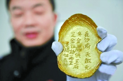 警方展示追回的一级文物五十两金锭,上面刻有“长沙府天启元年足金五十两等字样。