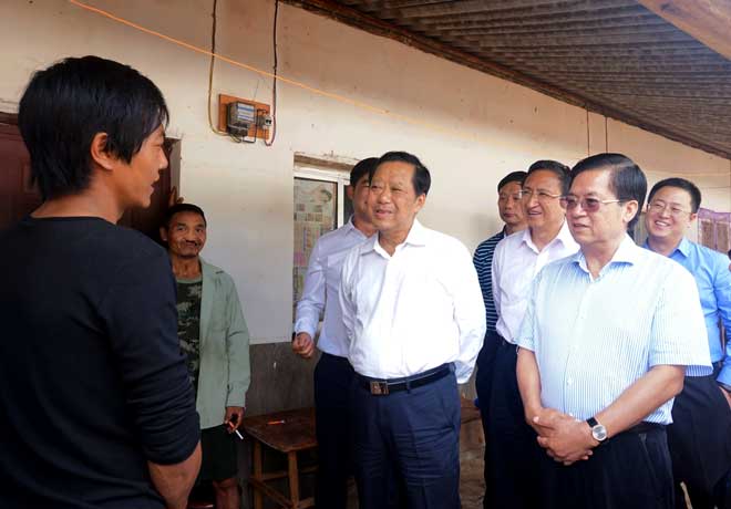 10月12日,调研组前往德宏州实地调研。在盈江县旧城镇芒克村,在听取脱贫攻坚的有关情况汇报后,刘晓峰、龚建明一行来到该村正在翻盖新房的傣族贫困户叶波艳恍家里,当看到新房顶上有电线通过,龚建明急忙嘱咐当地负责同志要进行电线改路,以防火灾发生。当天下午,调研组前往瑞丽市户育乡尹山村民小组调研,在听取当地脱贫攻坚的有关情况汇报后,刘晓峰、龚建明一行来到该村景颇族贫困户杨腊和杨三家中,与两家人亲切交谈,鼓励他们早日走上致富道路。途中,调研组还调研了瑞丽市口岸喊撒排涝沟(拟建)情况。