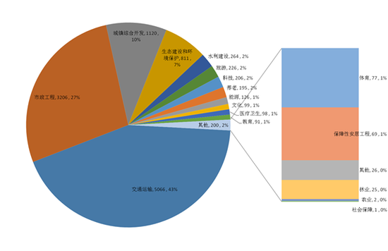 市政工程类项目共计223个,投资总额3205.96亿元,项目数量占比43%,投资总额占比27%。