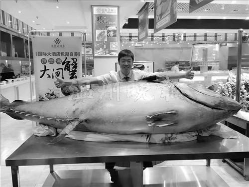 不久前,马云豪掷38888元拍下136斤的日本蓝鳍金枪鱼,宴请阿里巴巴员工吃生鱼片。昨天,乐清国际大酒店出现了一条重达715斤、长约2.5米的蓝鳍金枪鱼。酒店董事长卢启旺说,这条蓝鳍金枪鱼市场价在300万元左右,最贵的一块腮帮子肉每两售价3800元。据悉,迄今为止,在国内也罕见如此大的蓝鳍金枪鱼。