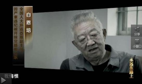 由中央纪委宣传部和中央电视台联合制作的大型电视专题片《永远在路上》17日晚开播。当晚播出第一集《人心向背》,其中有白恩培、周本顺、李春城等几名落马省部级高官出镜,现身说法,片中透露出不少贪腐细节,发人深省。