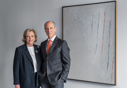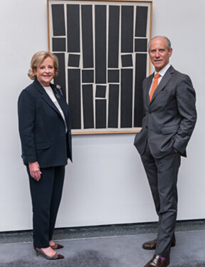 现代美术馆在一份声明中写道,“本次捐赠藏品的广度前所未有”,但并未披露此次捐赠的价值总额。图为收藏家斯内洛斯与现代美术馆总监洛瑞在委内瑞拉艺术家亚历杭德罗?奥特罗 (Alejandro Otero, 1921–1990) 于 1950 年绘制的布面油画作品《白色背景上的彩色线条》 (Colored Lines on White Background) 前合影留念。该画作创意新颖,尺寸为 51.25 x 38.25 英寸(约为 130.2 × 97.2 厘米)。