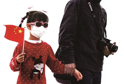 昨天雾霾继续笼罩京城,很多孩子都戴上了大人的口罩 摄影/本报记者 郝羿