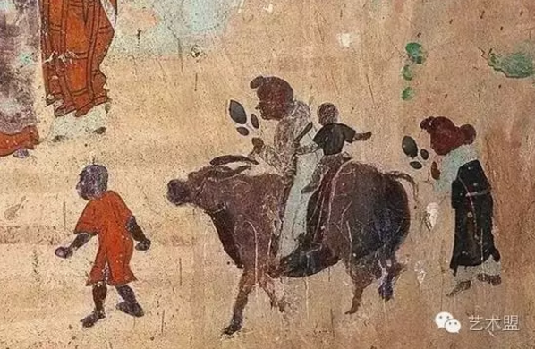有信仰的中国古人,家庭团聚时会选择集体顶礼膜拜。在莫高窟第323窟南壁的佛教史?;?,保留有一家老少四口前往江边瞻礼佛像的有趣画面,这其实也是一幅家庭出游图?;嬷心棠毯退镒右黄鹱谒1成?,奶奶和主妇手持花朵预备供佛,饶有趣味。