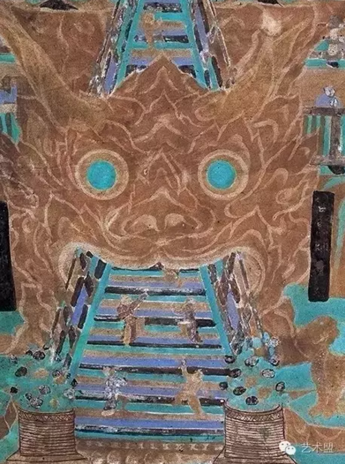比如莫高窟壁画中有牛头山图,是佛教自印度经于阗东传中国的缩影之一。莫高窟第454窟牛头山圣迹图中就有登天梯的画面,天梯巧妙的穿过牛头,攀登天梯的人显的极为渺小,画师绘制通过大小对比,凸显出牛头庞大的体量感。牛头山据说就在今天新疆的和田绿洲西南部。