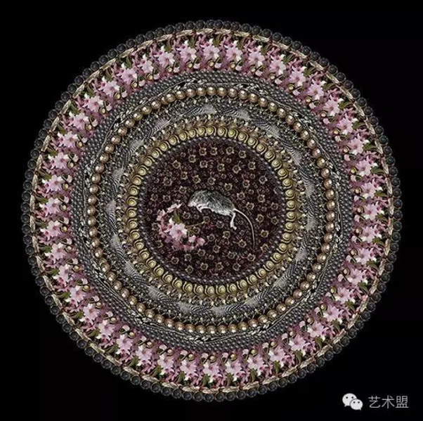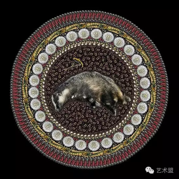 在英国艺术家Fleur Alston的系列作品《全部(Kit and Caboodle)》里,她创作出了错综复杂的拼贴曼陀罗画,每幅画的中心都有一只已经死去的动物。曼陀罗,在印度教和佛教里是指一切圣贤、一切功德的聚集之处;而在Alston用于纪念死去动物的画里,也象征着平衡、循环与生死轮回。为了创作曼陀罗画,Alston在动物周围采用了与它们栖息环境息息相关的元素。而这幅画的其他主要部分,例如黑色的背景,会让人想起Portia Munson的作品。而画中圆圈的表现形式则借鉴了Tamany Baker的摄影特点;艺术家们探寻动物死亡的各种作品我永远都看不倦,同时我也同样认为Alston的每一幅曼陀罗画都十分有意义。