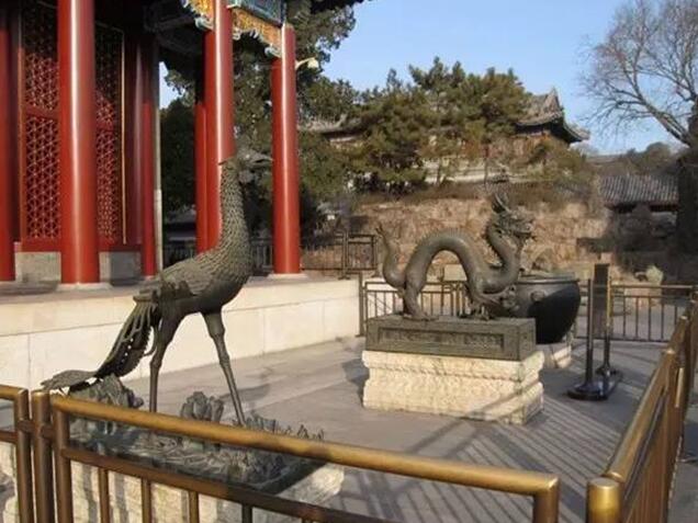在仁寿殿的外月台上,南侧和北侧各有一对铜龙凤,可以燃香,铜凤的基座上刻有“天地一家春”的印记。