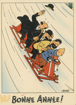对于埃尔热而言,“白雪地图”系列代表了他逃离日常生活的冒险乐趣。每张卡片都是一个惊喜,叙述了一个小故事:丁丁和米卢发现了山所带来的快乐,他们滑雪、乘雪橇、装饰圣诞树。无论是踩着滑雪板上还是穿着滑冰鞋,杜邦始终都是那么笨拙可爱。