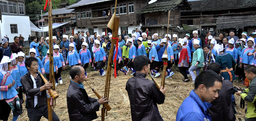 当日,贵州省榕江县定威水族乡亚勇村水族同胞身着节日盛装,载歌载舞欢度一年一度的瓜节。水族瓜节又称水族端节,是水族最盛大的传统节日。每年秋季农作物收割后,水族同胞选择吉日欢度瓜节,祈祷来年风调雨顺,幸福安康。