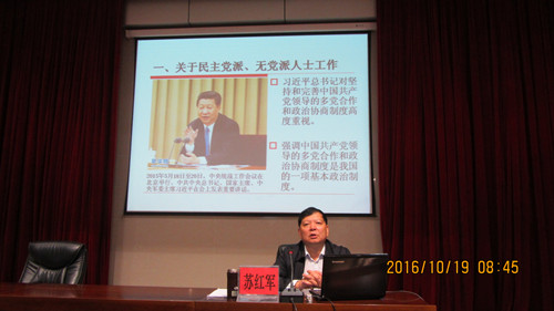 10月19日上午,省委统战部常务副部长苏红军受邀为2016年普洱市统一战线干部培训班学员授课。普洱市委常委、统战部长魏艺红主持培训会。