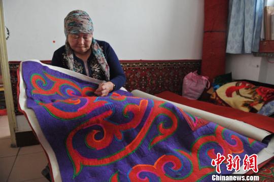 图为哈萨克族手工艺人制作毡垫?!⊙钛廾?摄