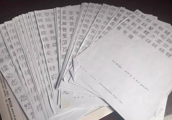 在叶根友家,我看到了小朋友写的字,一沓一沓的,每页120个,一共57页,放在两套盒子里。