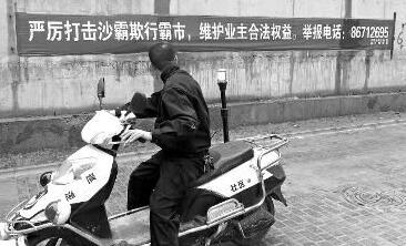 华商报记者注意到,在小区院子内有一堆沙子,上面扔着一个牌子,写着“沙子、水泥、红砖”几个大字,牌子上面标注着价格和联系方式。附近墙上挂着一个红色横幅“严厉打击沙霸欺行霸市,维护业主合法利益”,并留有举报电话。
