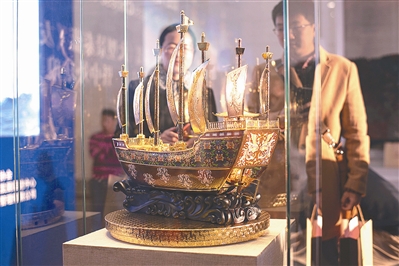 日前,作为一带一路、2016工美基金项目启动的重要作品,工艺美术大师制作的景泰蓝《友谊之船》在京亮相。与此同时,这件重要展品将正式进驻新开馆的中外珐琅美术馆,亮相“宫廷华彩·珐琅夺辉——中外珐琅艺术精品展”。景泰蓝《友谊之船》是中国赠送英国、印度的国礼,由北京工美集团设计制作,以郑和所率宝船为原型,由景泰蓝、金属錾刻和铸造多种工艺结合制作而成。记者 王萌 文/摄