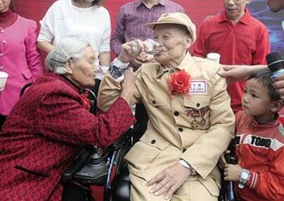 中午11:18,在儿孙们的簇拥下,“东方红,太阳升……”古臣坤哼起了他最爱听的歌曲《东方红》。这场特殊的结婚仪式,几乎让全村人聚齐。没有浪漫的仪式,没有煽情的语言,仪式上,记录老人生活点滴的相片,看哭了不少乡邻,但何光英和古臣坤笑着,看着一张张记录彼此艰辛的相片从眼前晃过:无论春夏秋冬,何光英总是推着老伴,在村里行走,房前小道,轮椅压过的两道车辙已烙下了半个多世纪的相濡以沫。
