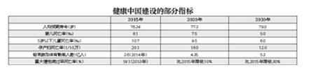 《规划纲要》指出,2020年,人均预期寿命达到77.3岁,2030年达到79岁。婴儿死亡率、5岁以下儿童死亡率、孕产妇死亡率分别从目前的8.1‰、10.7‰和20.1/10万,下降至2030年的5.0‰、6.0‰和12/10万。到2030年,实现全人群、全生命周期的慢性病健康管理,总体癌症5年生存率提高15%。加强口腔卫生,12岁儿童患龋率控制在25%以内。2030年,居民健康素养水平提升至30%,经常参加体育锻炼人数从2014年的3.6亿人上升至5.3亿人。
