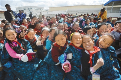 图为那曲地区聂荣县完全小学,1500名学生穿着新的民族风格的校服喜笑颜开。
