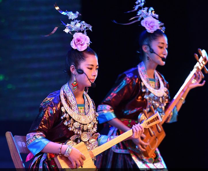 10月26日,广西三江县的侗族姑娘在表演侗族琵琶歌。