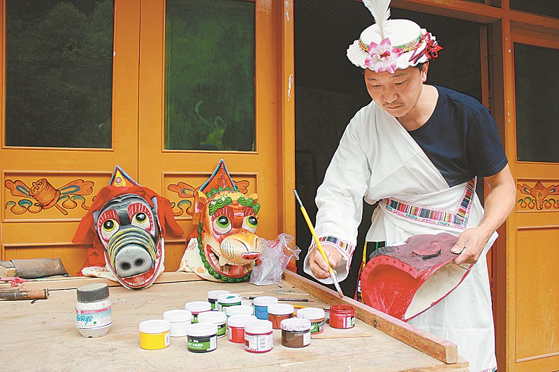 舞,意为吉祥面具舞,2006年,九寨沟县舞被列入国家级非物质文化遗产目录。尽管当地很多白马藏族人会跳,但会制作舞面具的却不多。当了近30年木匠的郭新平,就是九寨沟县会制作舞面具的人。