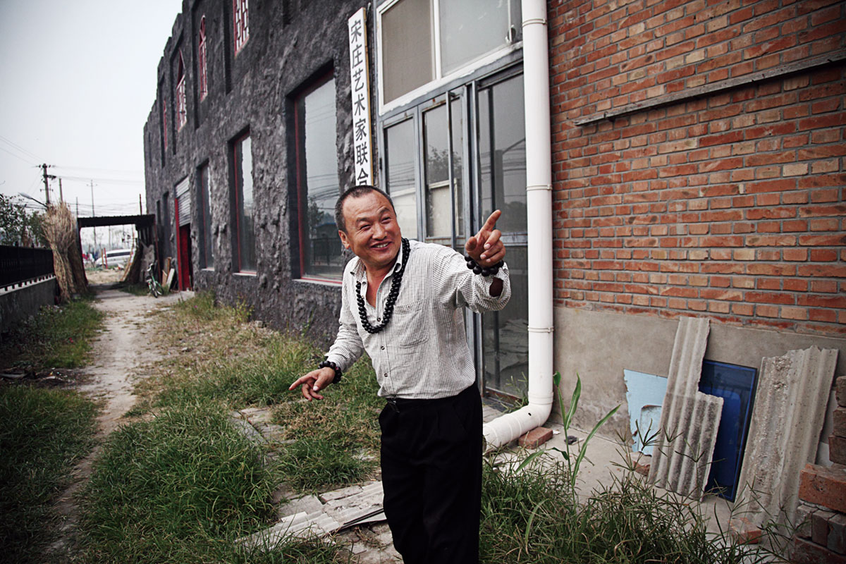 从宋庄大牌楼一头扎向北,就会撞上宋庄的地标——宋庄环岛雕塑?!案玫袼芨?0米,底座直径15米,类尖塔型,分别由金、银、铜、铁、锡、砖、沙,七部分组成”,2009 年的新闻里这样写, “整体带有宋庄艺术家群落积极向上的寓意”。宋庄为这个雕塑举办过一次征名大奖赛,奖品是“艺术衍生品《宋庄之窗》一套”。它最终被命名为“争鸣”。牌楼到雕塑之间的大街就是宋庄的主干道,道路两边分布着各种画廊、美术馆和饭馆,看上去严整漂亮,完全没有农村的面貌。目前,宋庄有农民不到两千人,在此定居的艺术家共五千多,政府将宋庄作为“文化产业园区”来经营已有十年。如果一个十年前的宋庄农民陡然穿越到今日,一定会为这个村庄的改变目瞪口呆,但老金和当地的农民已陪宋庄一起度过了这十年。今日在老金的心目中,宋庄的地图很分明: “马路以东艺术商人和不出名的艺术家多,马路以西全是出了名的职业艺术家,像老栗(栗宪庭)和伊灵他们全在马路以西?!?/p>