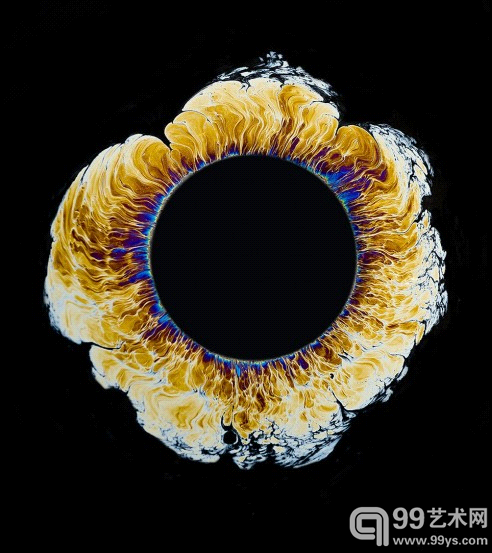 照片中,油滴不停扩散,在镜头中呈现出爆炸般的复杂色彩,