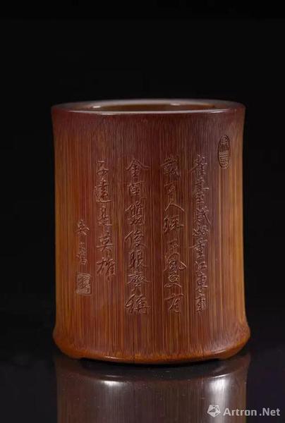 漆跃文以朱三松为例做出赏析:“朱三松,名稚征,与其父小松、祖父松邻合称‘嘉定三朱’,均为竹刻史上里程碑式的人物,而以三松成就最高,有出蓝之誉。本次展出的朱三松款竹仕女图笔筒,集镂雕、浮雕、阴刻等技法为一炉,精益求精,不同凡响。此器色泽深红,圆筒式,下承三矮足。外壁镂雕仕女,头戴风帽,手拈兰花,傍石而立,身周洞石壁立,通透异常,古松穿岩而出,盘曲矫健。松下石台上浅浮雕杯、砚、盆景等案头清供。石壁上阴刻行书:‘万历甲寅(万历四十二年,1614 年)秋八月’,旁刻‘三松作’款识。另一侧石上阴刻隶书填绿乾隆御题诗一首并有‘乾隆丁酉新月御题’九字,下有‘乾’‘隆’二小印。”
