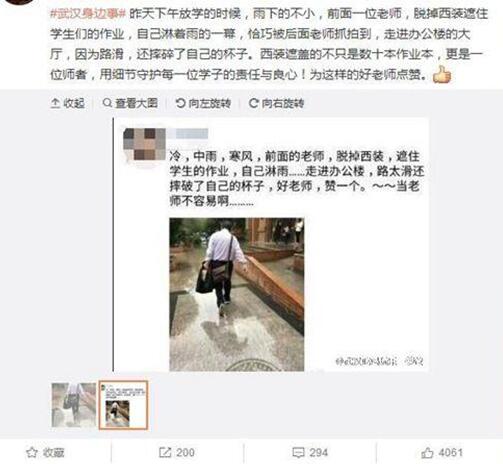 “下午放学的时候,雨下的不小,前面一位老师,脱掉西装遮住学生们的作业,自己淋着雨的一幕,恰巧被后面老师抓拍到……”10月26日,武汉科技大学城市学院官方微博发布的一条图文信息在网络悄然走红,4000余名网友点赞他是“可敬可爱的好老师”。