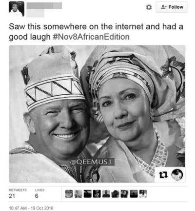 在非洲网民所发的推特中,希拉里和特朗普被PS在了一起,两人的脸被嵌在两个身着非洲特色服饰的身体中。