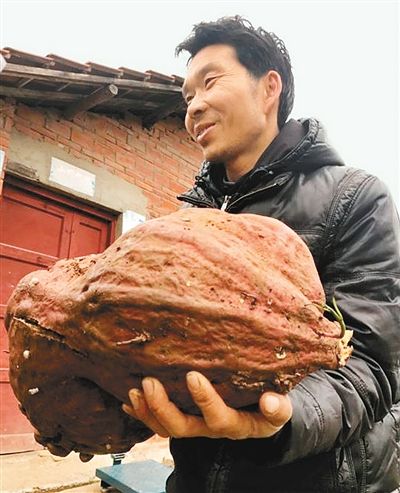 10月28日,勉县老道寺镇新立村的毛海泉在自家地里挖出一个近15公斤重的巨无霸红薯。